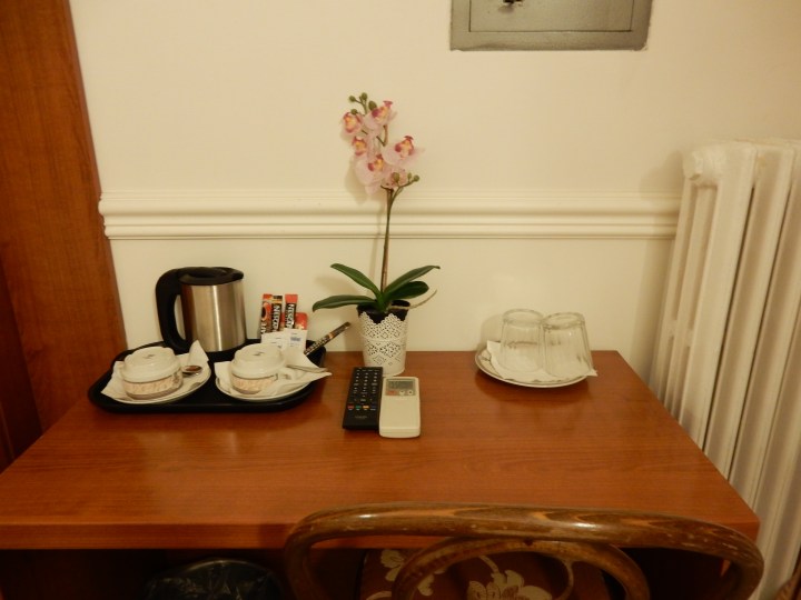 We had our own water kettle with tea and instant coffee, a small flatscreen, a safe and a balcony with a view to the hotel’s inner yard.