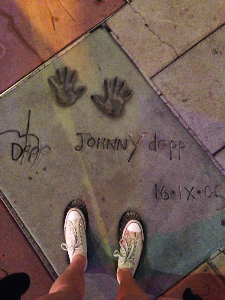 By now, the sun has already set and it was dark outside – unfortunately we missed our first Californian sunset. Nevertheless, everything looked so beautiful because of the colorful lighting. In front of the TCL Chinese Theatre we finally found the hand and footprints of lots of celebrities that were pressed in cement. I put my hands in the ones of Johnny Depp, Ben Stiller and co – weird but cool.
